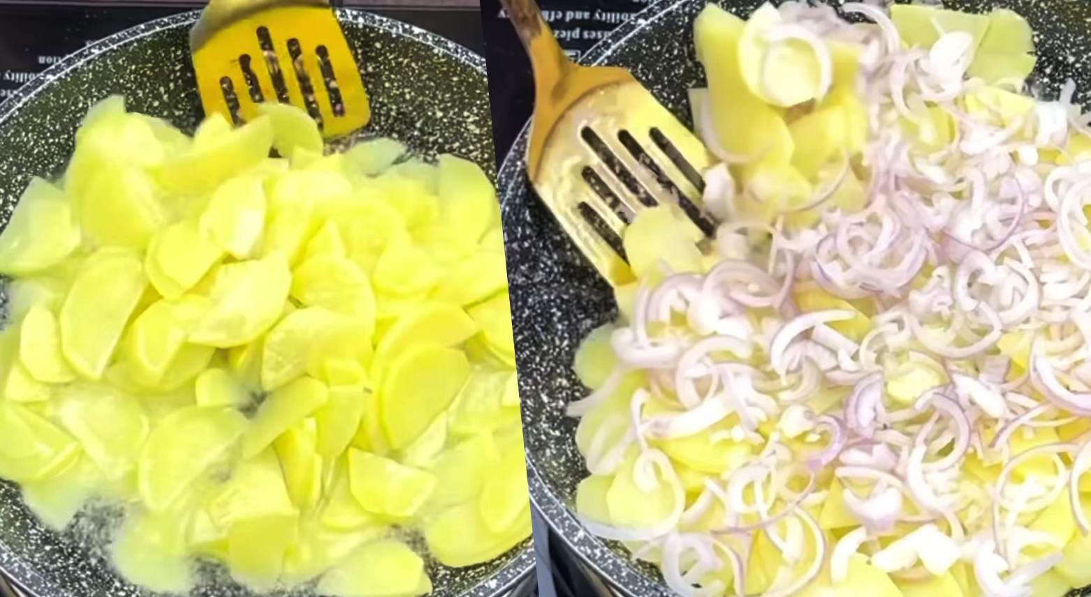 ➥ আলু ১ মিনিট ভাজা হয়ে গেলেই কড়ায় পেঁয়াজ কুচি যোগ করে একসাথে ভালো করে ২ মিনিট ভেজে তেল ঝরিয়ে তুলে আলাদা করে নিন। আর ডিম ফেটানো পাত্রের মধ্যে দিয়ে সবটা ভালো করে মিশিয়ে নিন।