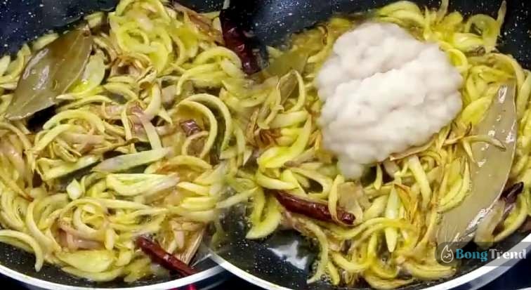 ➥ ফোঁড়ন দেওয়ার পর পেঁয়াজ কুচি দিয়ে ভাজতে শুরু করতে হবে। হালকা ব্রাউন রং হয়ে গেলে পেঁয়াজ বাটা দিয়ে ২ মিনিট নেড়েচেড়ে নিতে হবে। তারপর কড়ায় ১ চামচ মত আদা রসুন বাটা ও টমেটো কুচি ও নুন দিয়ে সবটা নেড়েচেড়ে ঢাকা দিয়ে ৩-৫ মিনিট ঢাকা দিয়ে মিডিয়াম আছে রান্না করে নিতে হবে।